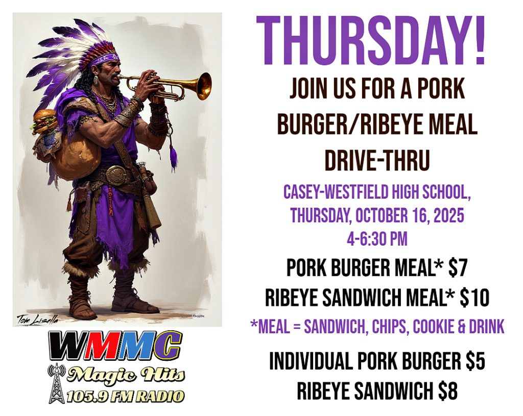 Casey-Westfield Band Boosters to host Pork Burger / Ribeye Sandwich Drive-Thru Thursday, October 16, 2025