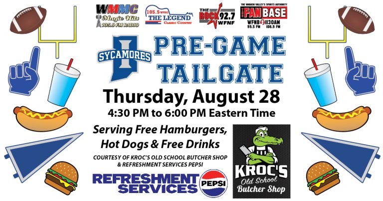Magic Hits 105.9 FM WMMC, The Legend 105.5 FM WVIG, The Fanbase 1130 AM WFNB and The Rock 92.7 FM WFNF are gearing up for the season opener of Indiana … Continue reading ISU Sycamores Pre-Game Tailgate: August 28