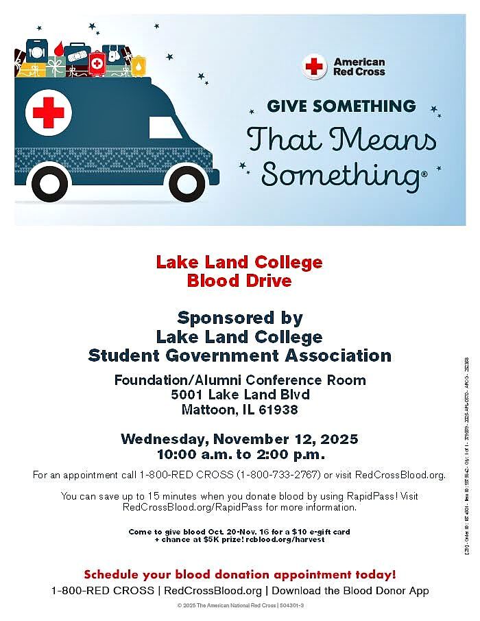A blood drive will be held on Wednesday, November 12, from 10am to 2pm in the Foundation/Alumni Conference room at Lake Land College in Mattoon, Illinois.