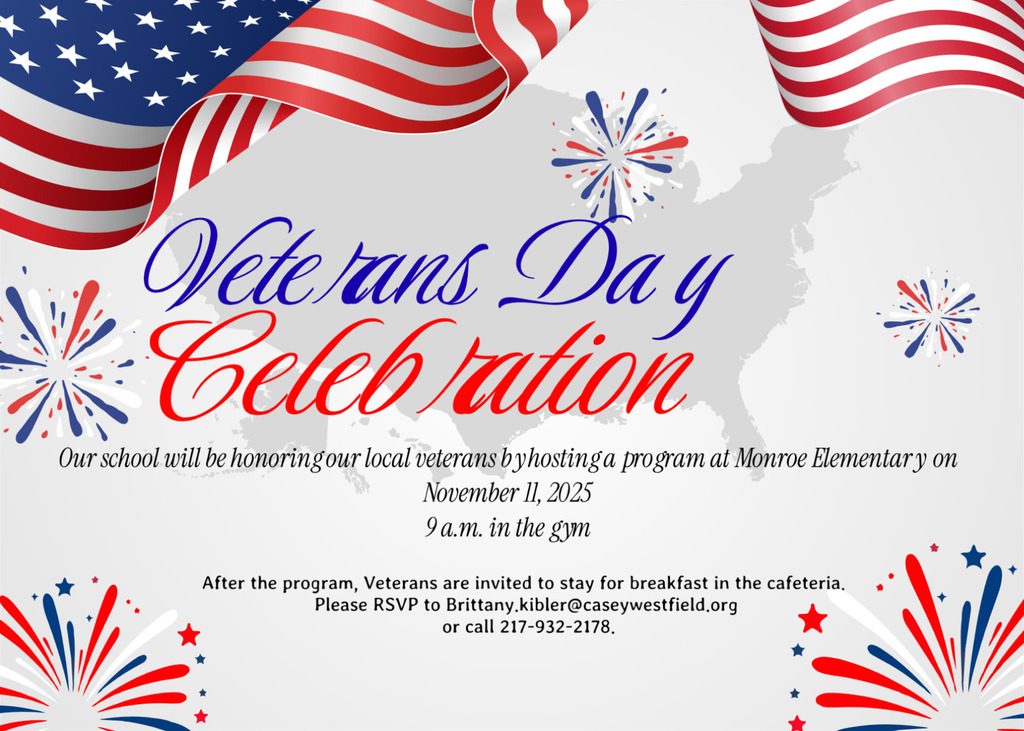 Monroe Elementary in Casey, Illinois will host its Veterans Day program on Tuesday, November 11, at 9am in the gym. After the program, veterans are invited to stay for breakfast in the cafeteria. Send RSVP to Brittany Kibler at the school.
