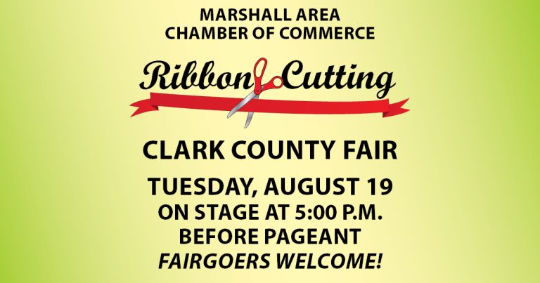 The Marshall Area Chamber of Commerce announced recently a ribbon cutting ceremony to be held on Tuesday, August 19, 2025 at 5:00 p.m. The ribbon cutting will take place on … Continue reading Ribbon Cutting to be held at Clark County Fair