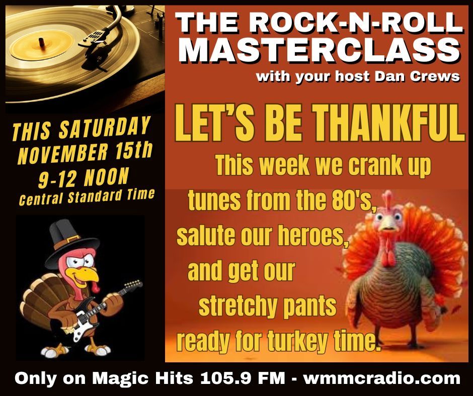 Tune in to Magic Hits 105.9 FM at 9am on Saturday, November 15, 2025 for a Thankful Themed Rock-N-Roll Masterclass hosted by local DJ Dan Crews!